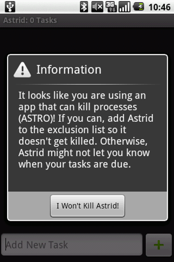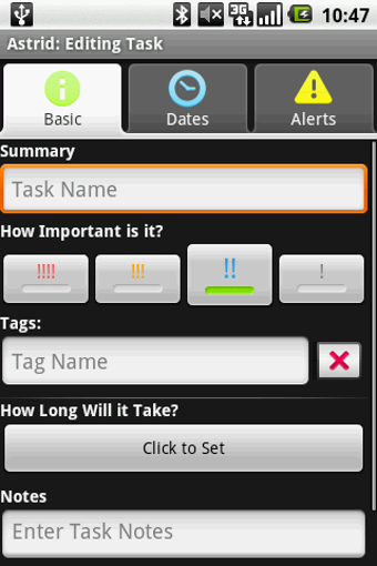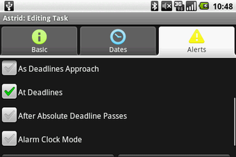 Astrid is ingedeeld in 3 handige tabbladen, alwaar je basistaken, afspraken en alerts (notificaties) instelt. Je zet het beste automatische proces-sluiters zoals Astro File Manager uit voordat je taken agendeert met Astrid. Op deze manier blijft Astrid altijd in staat je te herinneren.